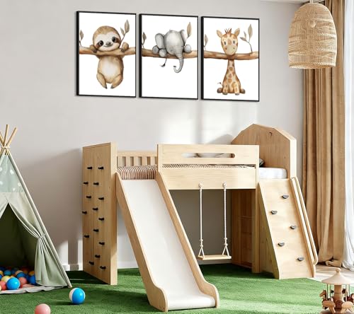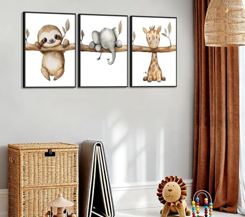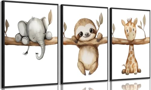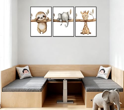 3Pcs Nursery Animal Wall Art Safari Nursery Picture Painting Jungle Animal Wall Decor Cute Elephant Sloth Giraffe Posters Prints Artwork for Boys Girls Baby Room Decoration 12x16in