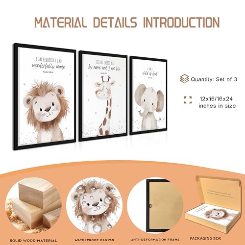 Nursery Wall Art, Kids Bible Verse Animal Canvas Wall Decor Paintings, Cute Safari Christian Pictures Posters Prints for Kids Boys and Girls Room Bedroom 16×24 Inch Wood Framed